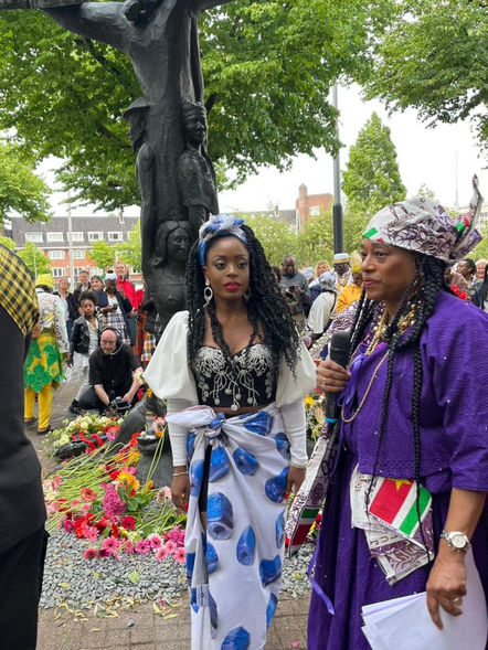 Kizzy zong Caribische liederen voor de Nederlandse -, Caribische - en Surinaamse delegatie en vertolkte vervolgens de 8 volksliederen tijdens de 30 Juni, Dag van Besef ceremonie in Amsterdam.